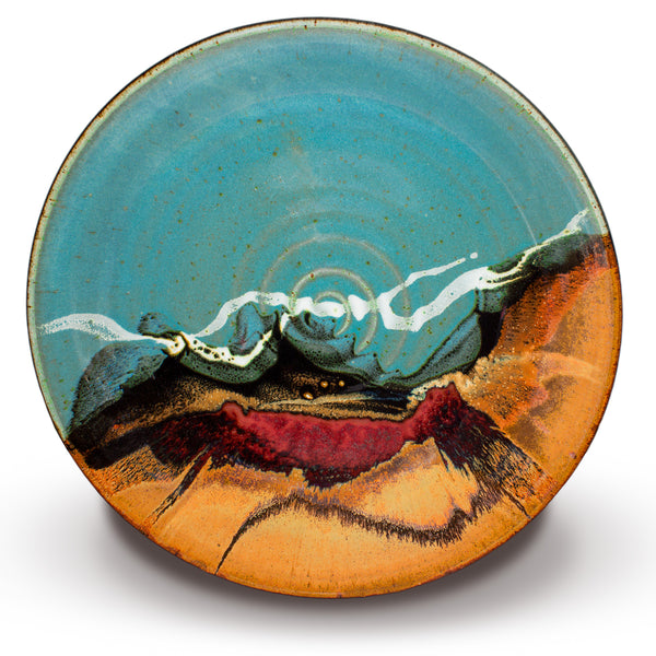 Here is a large 13 3/4" bowl in our Turquoise-Brown color combination. It is accented with wispy ribbons of white and a swath of red over toasted brown. This handsome piece can be put to work as a functional serving bowl or decoratively in your room decor. It is handmade, lead-free, microwable, and food & dishwasher-safe.